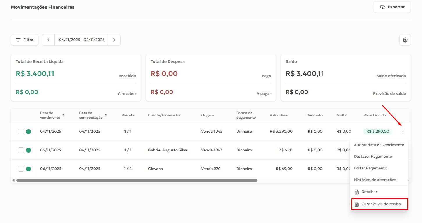 Agora você pode gerar a 2ª via dos recibos diretamente pela tela de movimentações financeiras.