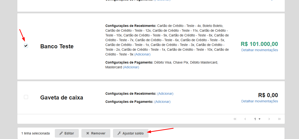 Na próxima tela, selecione a conta que deseja ajustar e clique na opção Ajustar saldo, conforme indicado na imagem abaixo.