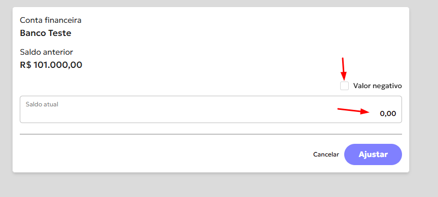 - Marcar a opção “Valor negativo” para ajustar o saldo automaticamente para zero