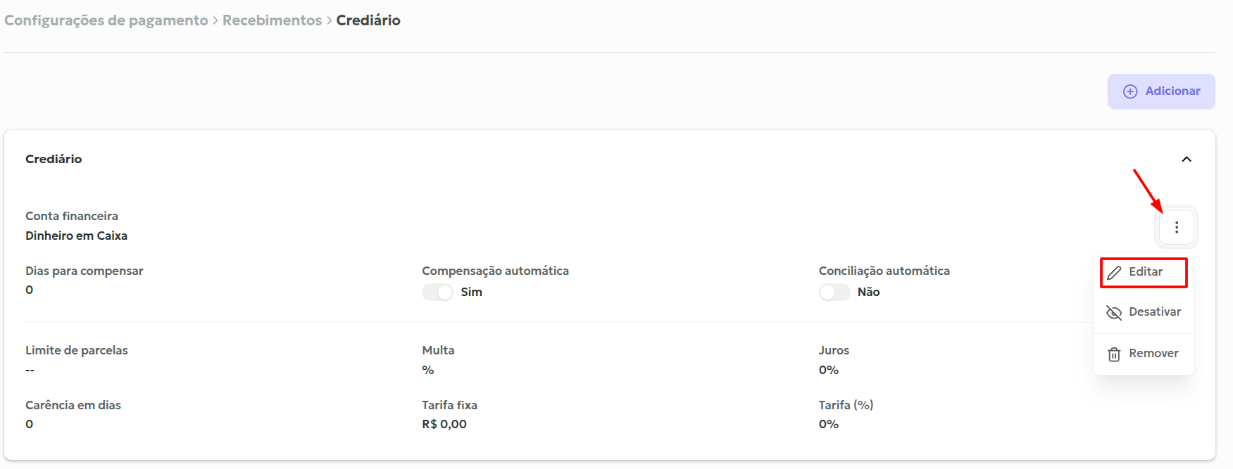 Abra as configurações do crediário > … > Editar