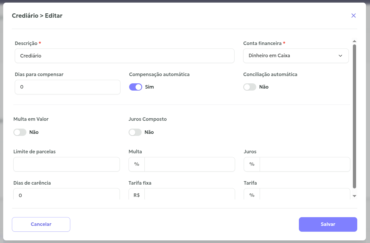 Feito isso, vai abrir a tela de edições e você vai conseguir definir todos os detalhes do seu crediário, como limite de parcelas que podem ser feitas no crediário, multas, juros e dias de carência!
