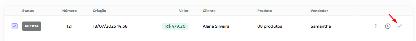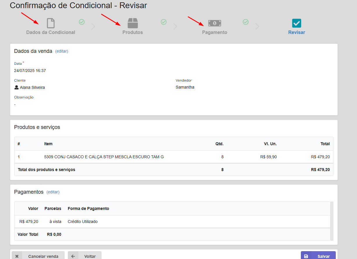 Lembrando: caso o cliente tenha devolvido produtos da condicional, é necessário realizar a devolução das peças antes de confirmar a venda.