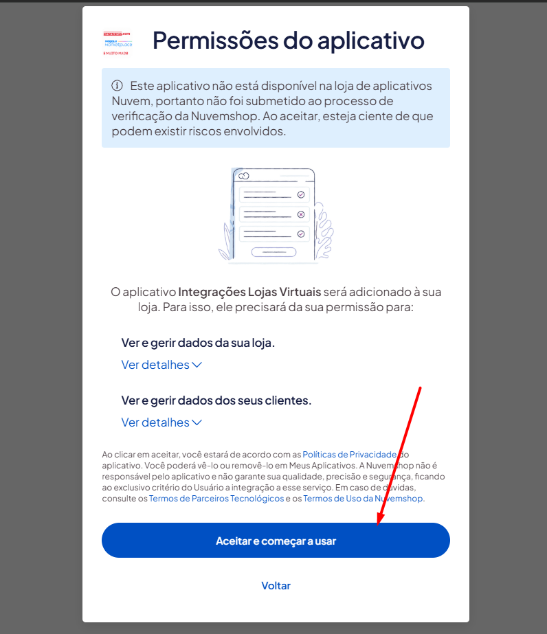 Será necessário aceitar e conceder as permissões solicitadas pelo aplicativo para concluir a integração.