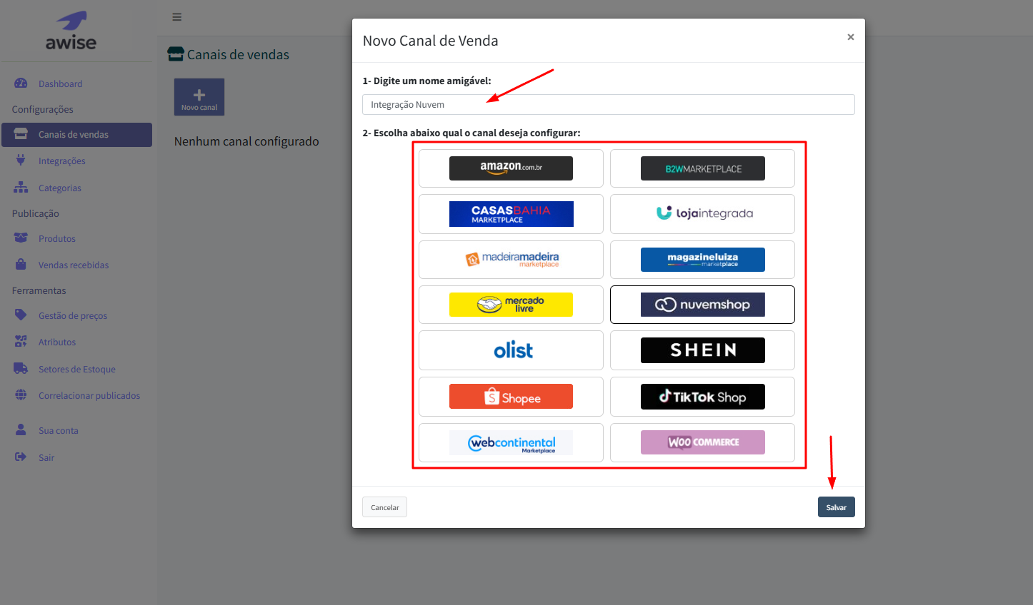 Essas permissões são essenciais para que o Awise consiga se comunicar corretamente com o canal de vendas selecionado.