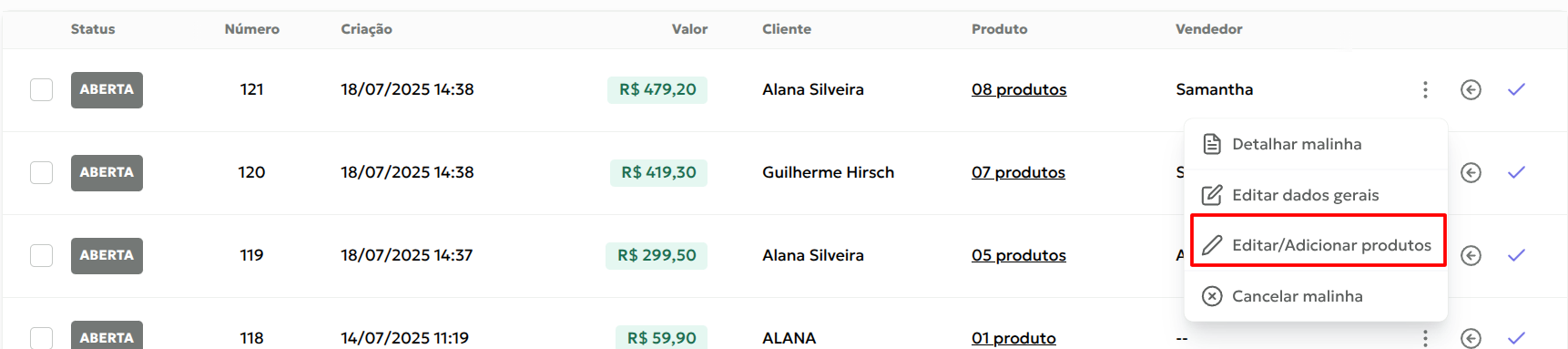 Clique em Editar/Adicionar produtos para seguir com a alteração.