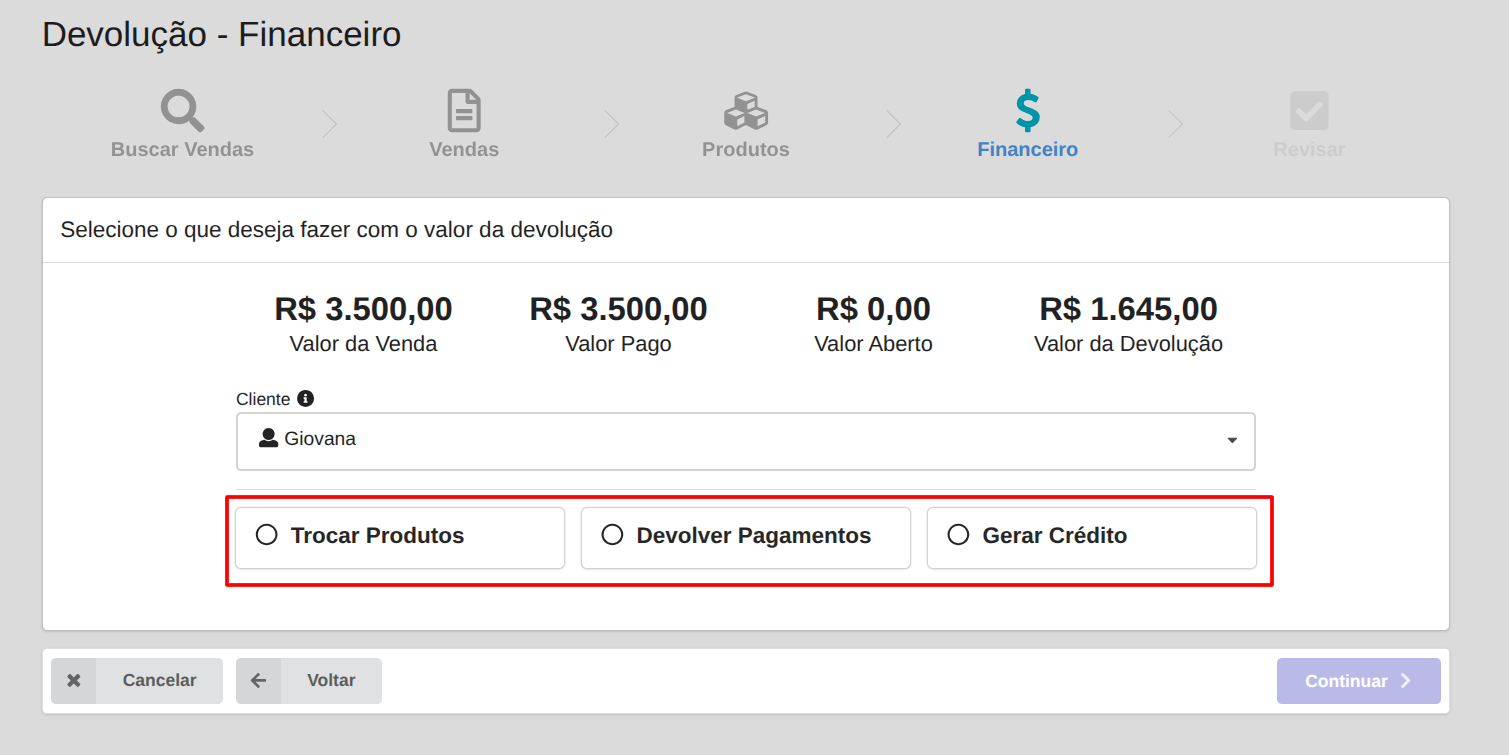 Na etapa seguinte, defina o que deseja fazer com o valor das peças devolvidas (como gerar crédito, estornar o valor, etc.) e clique em Continuar.