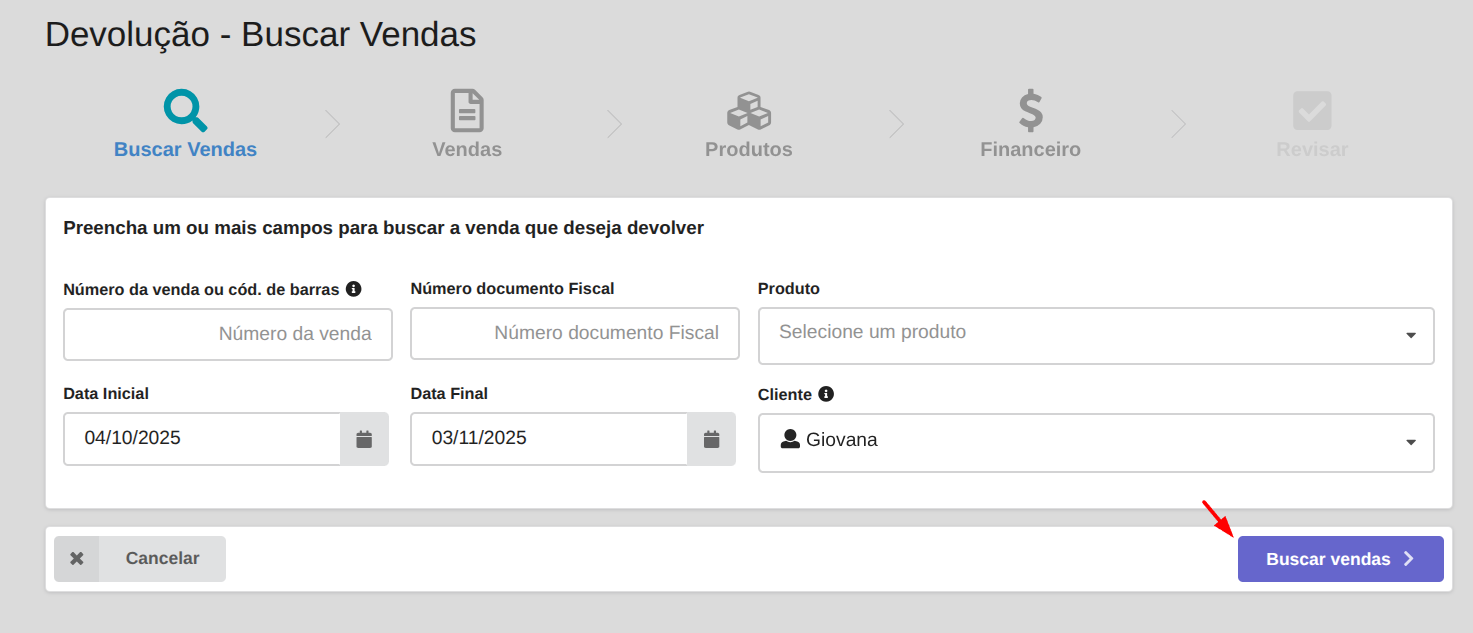 Após preencher um ou mais critérios, clique em Buscar vendas.