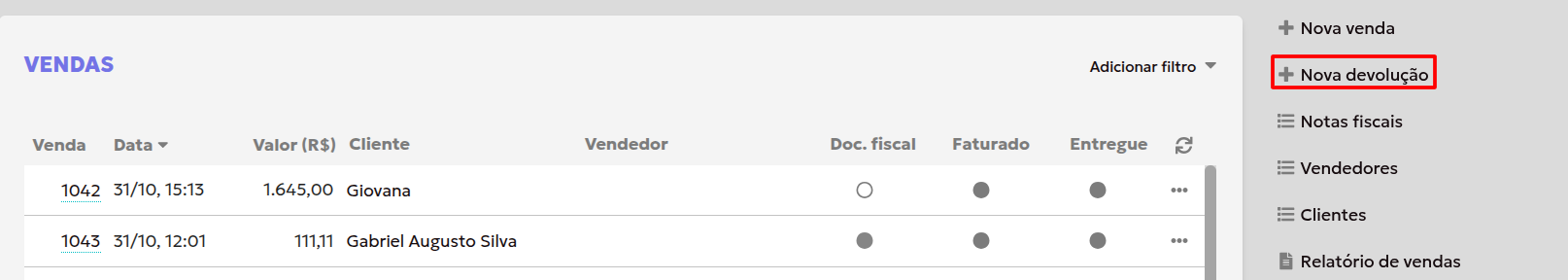 Acesse a Lista de vendas > Nova devolução para lançar a devolução da venda.