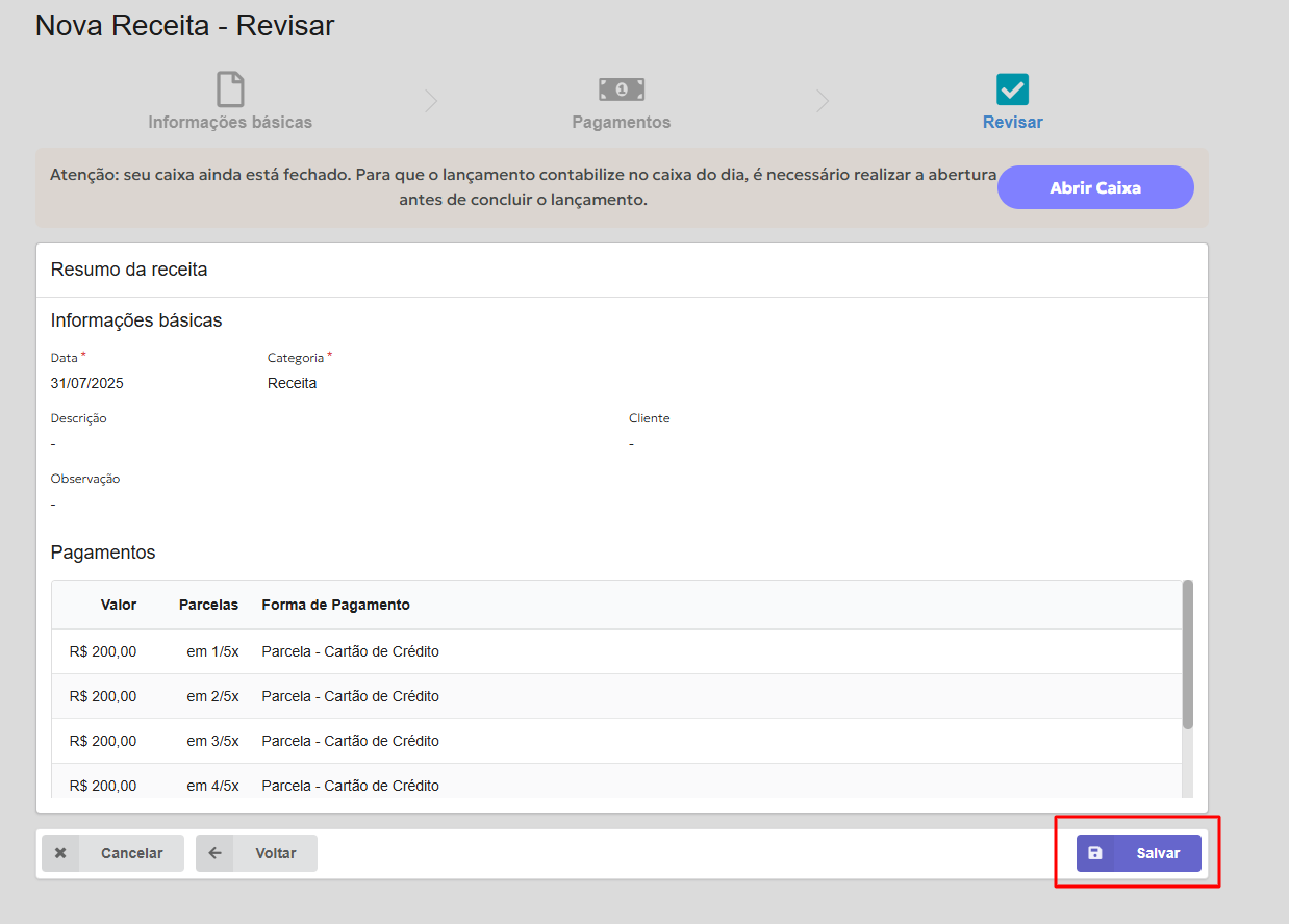 Na última tela, revise todas as informações preenchidas e, se estiver tudo certo, finalize clicando em Salvar.
