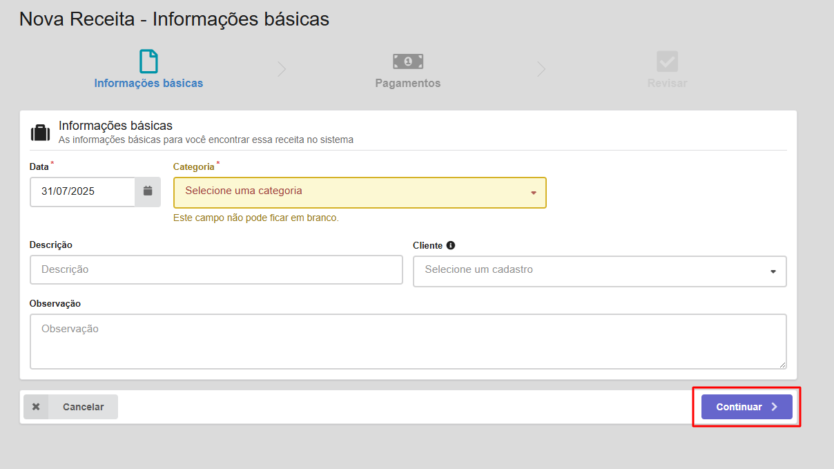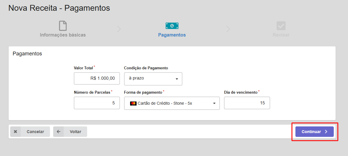 Após conferir e, se necessário, ajustar os valores, clique em Continuar para seguir para a última etapa.