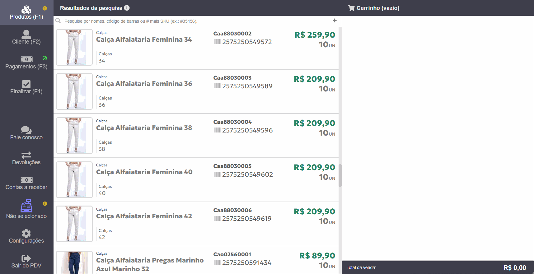 Nessa etapa, você pode bipar as etiquetas dos produtos para adicioná-los à venda ou selecionar manualmente, buscando pelo nome ou SKU.