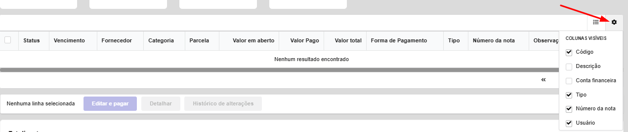 Dica extra – Na lista de contas a pagar, você pode configurar algumas informações que deseja que apareçam, como: Código da parcela, Descrição da Parcela, Conta Financeira vinculada, Tipo, Número da Nota de Origem da despesa e qual usuário fez o lançamento. Para isso é só clicar na engrenagem no canto direito da sua tela: