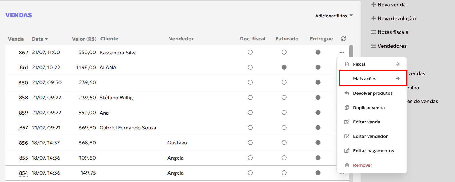 Na próxima tela, você verá a lista de todas as vendas realizadas.