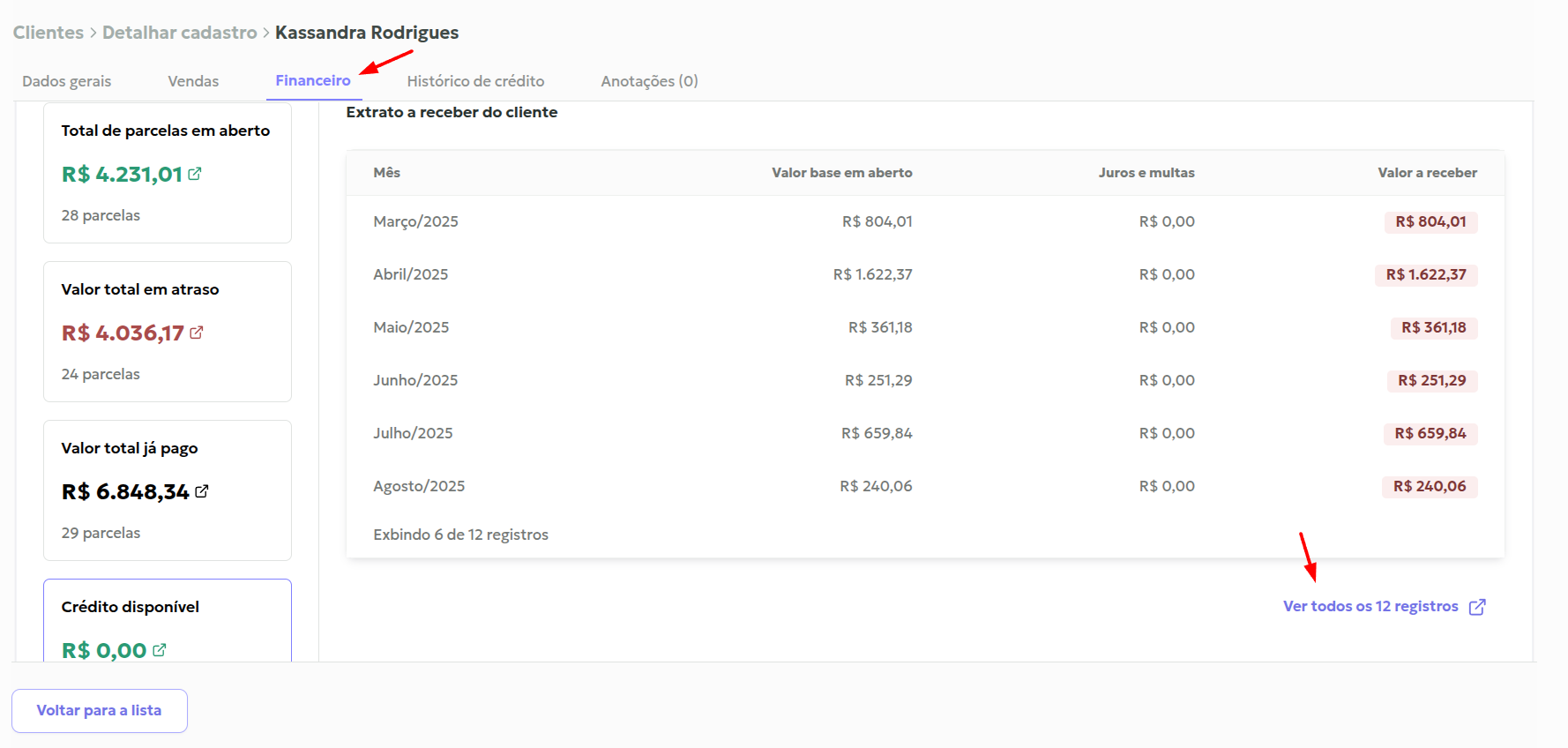 Na listagem de clientes, clique sobre o nome do cliente para abrir o cadastro.