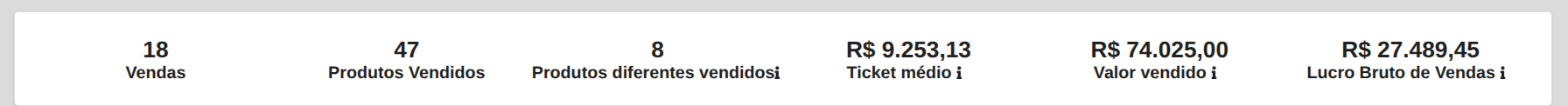- Ticket médio: Valor vendido dividido pela quantidade de produtos diferentes vendidos.