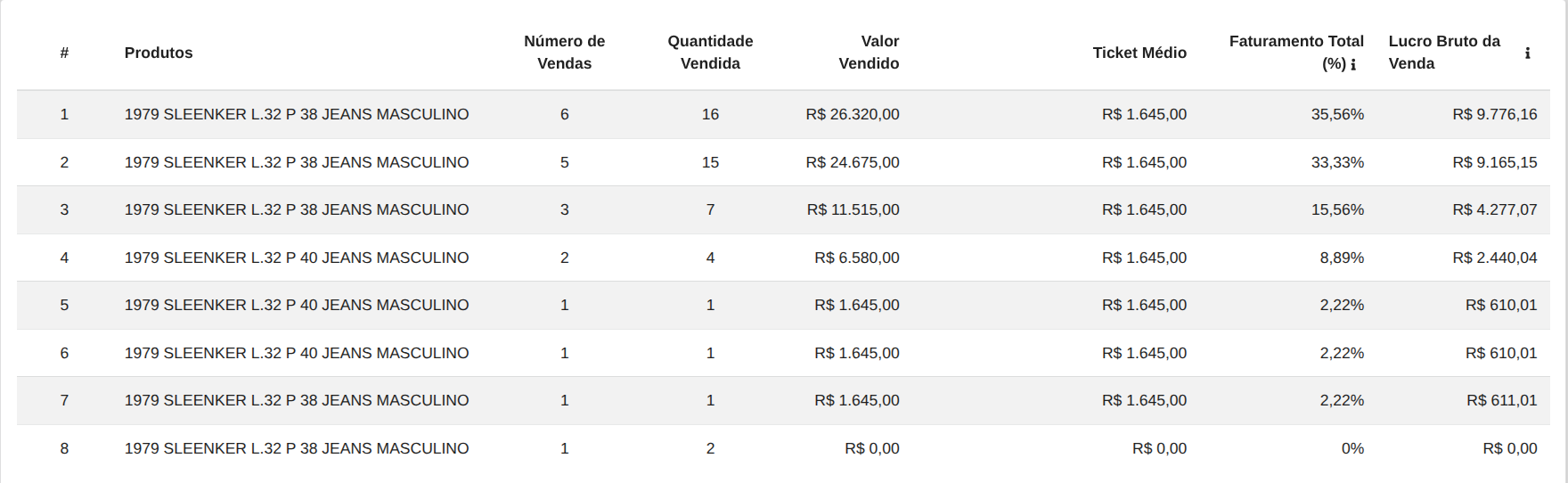 Faturamento (%): Porcentagem do faturamento total que esse produto representa no período.