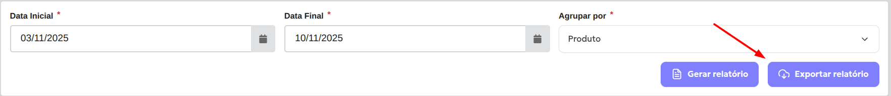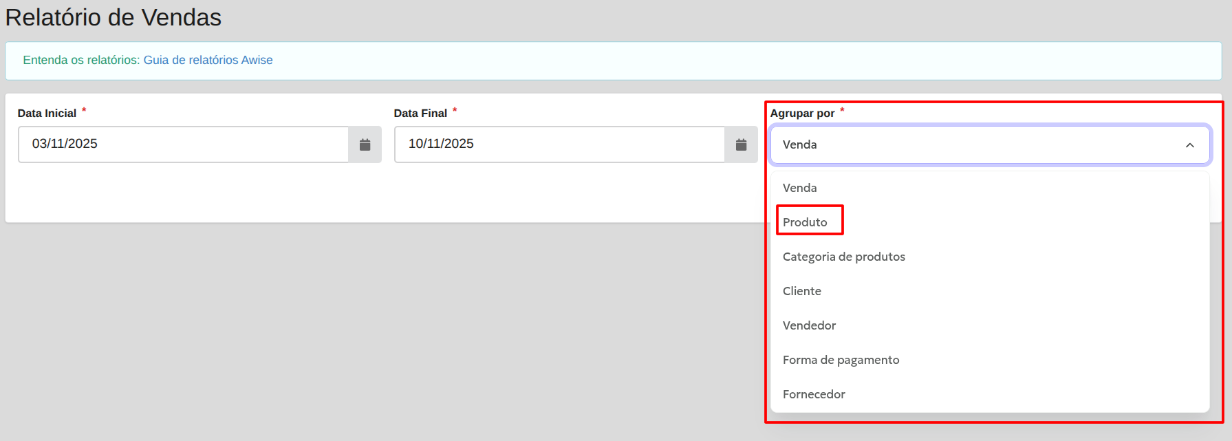Além de definir o período, você também consegue definir um tipo de agrupamento para a apresentação dos resultados. Para conferir o relatório de vendas de acordo com os produtos, deve selecionar a opção Produto