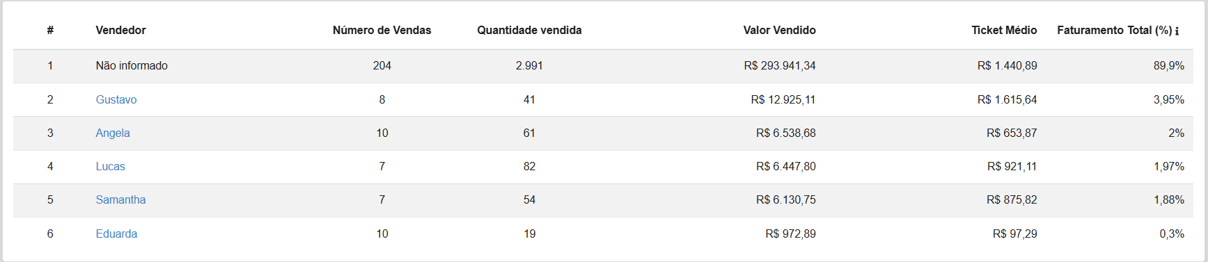 Logo abaixo do resumo, você verá uma lista com o desempenho de cada vendedor, incluindo: