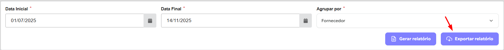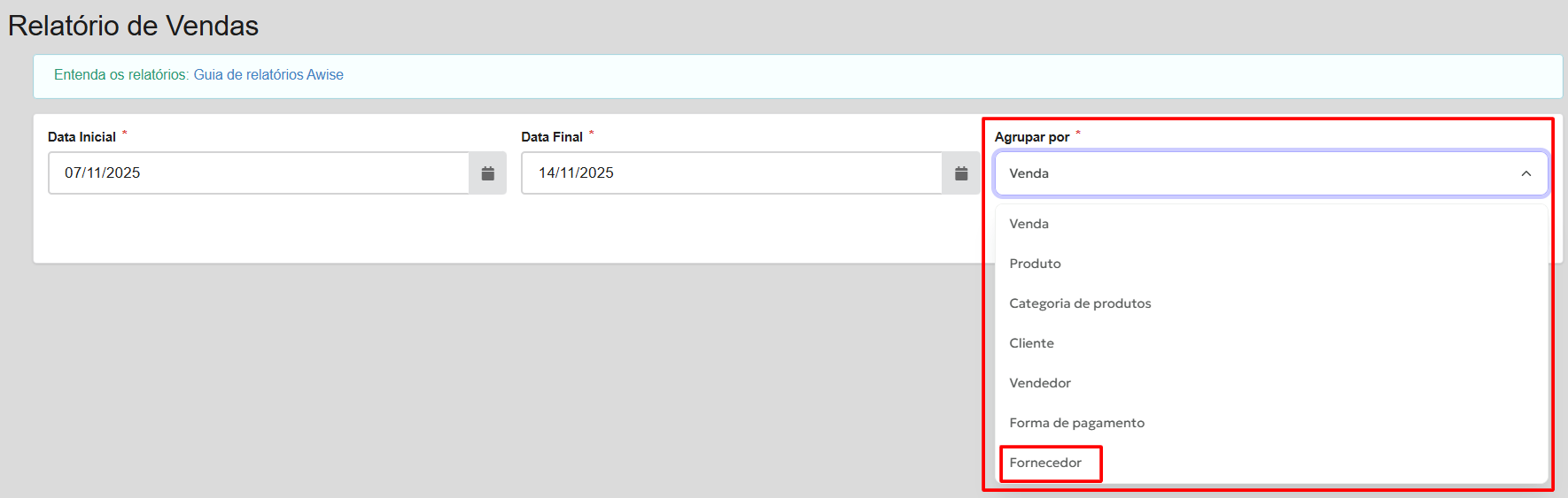 Para visualizar os dados por fornecedor, selecione a opção “Fornecedor” no campo de agrupamento.