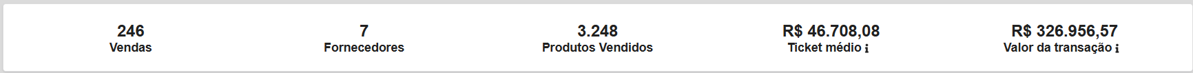 - Ticket médio: Valor médio das vendas com produtos do fornecedor