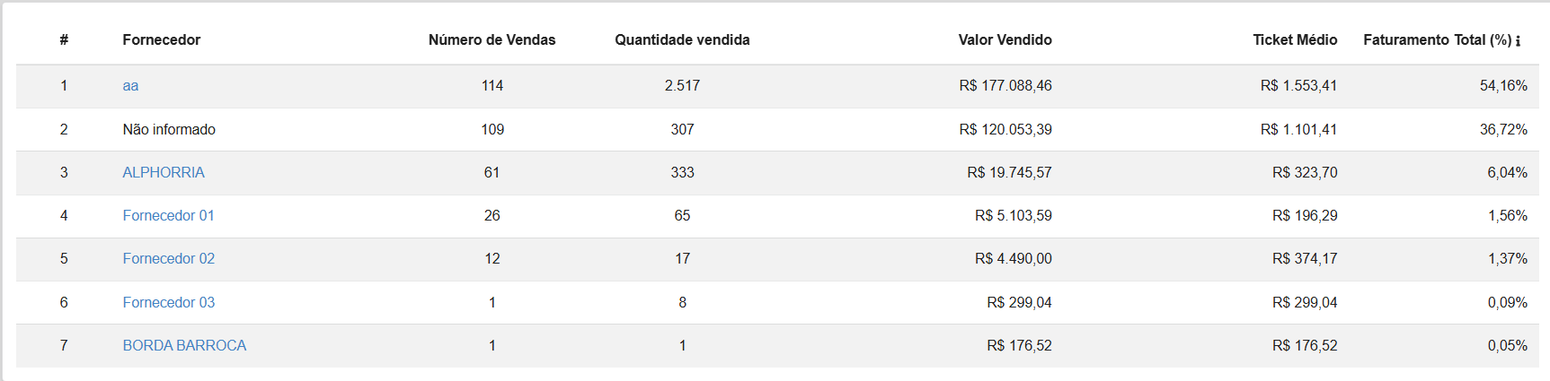 Os fornecedores são ordenados por representatividade no faturamento total, ou seja, os que mais venderam aparecem primeiro.