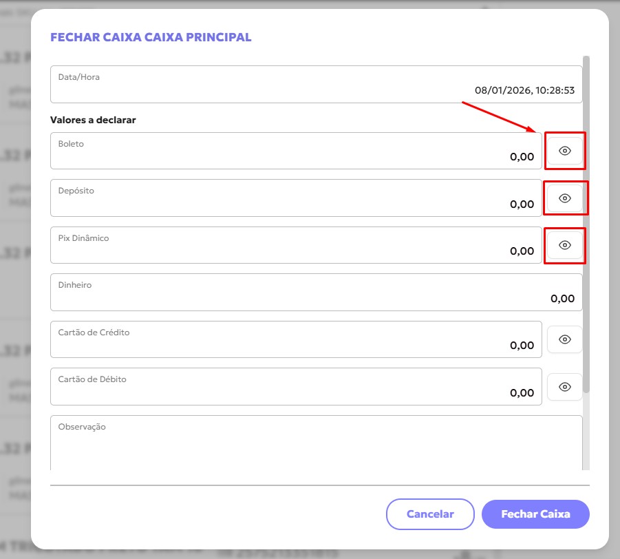 Ao informar o valor no campo (ex.: cartão), você vai ver um ícone ao lado: ao clicar nele, o sistema mostra todas as movimentações daquela forma de pagamento realizadas entre a abertura e o fechamento do caixa.