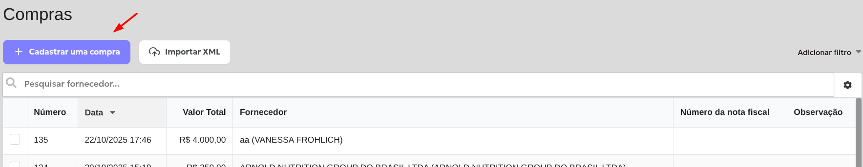Na tela que abrir, clique em Cadastrar uma compra, preencha as informações necessárias e finalize o lançamento.