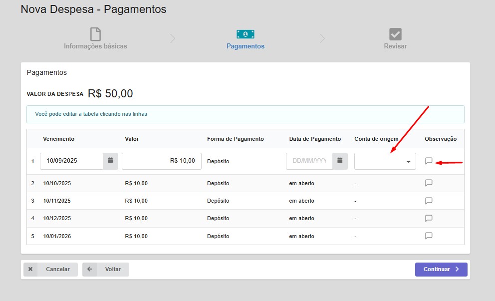 Além disso, também é possível adicionar observações por parcela, facilitando o controle e o entendimento de cada valor lançado.