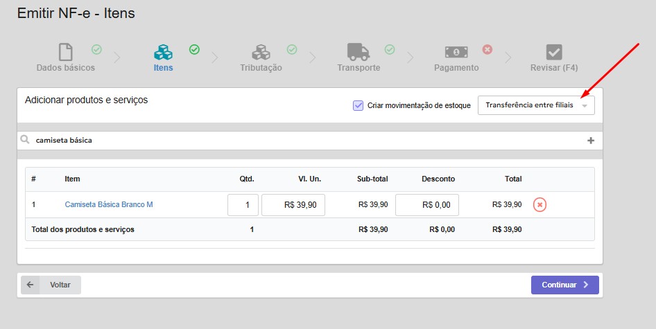 Agora, ao emitir uma nota avulsa ou uma nota de devolução ao fornecedor, você pode criar automaticamente as movimentações de estoque dos produtos dessa nota. Na etapa de seleção de produtos, basta escolher o motivo da movimentação — como remessa, devolução, entre outros — e, ao emitir a nota, o sistema gera tudo automaticamente.