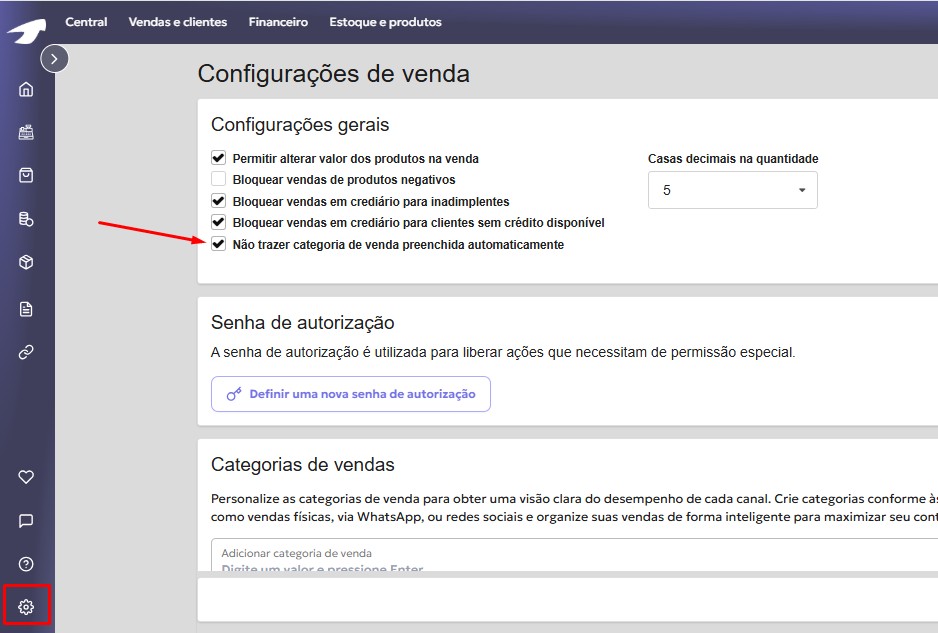 Acesse o menu Configurações > Configurações de venda e marque a opção “Não trazer a categoria de venda preenchida automaticamente”