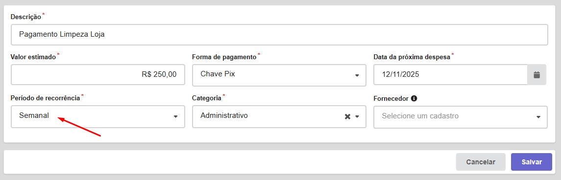 Agora você pode criar despesas que se repetem automaticamente toda semana, sem precisar lançar manualmente todas as vezes. Depois de configurada, basta acessar o Contas a Pagar e fazer a baixa para confirmar o pagamento. Prático, rápido e perfeito para manter suas finanças sempre em dia!