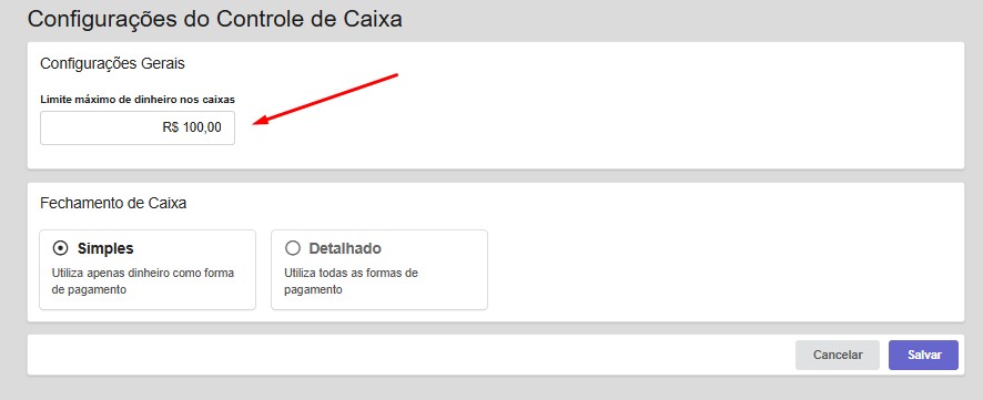 Para definir o limite máximo de dinheiro permitido nos seus caixas, acesse a central de Configurações > Financeiro > Controle de Caixas