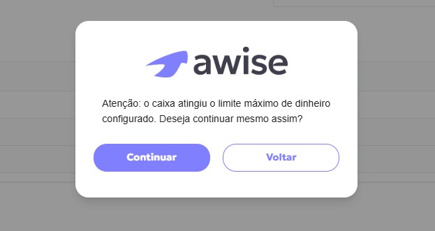 Tem novidade no caixa do Awise: ao configurar o limite máximo de dinheiro permitido nos caixas e atingir o limite, o sistema vai gerar uma notificação automaticamente ao salvar a venda: