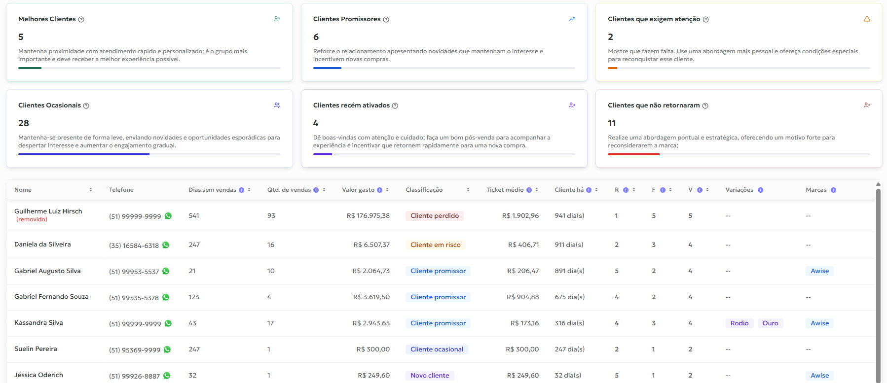 Com esses dados, o sistema gera uma pontuação e classifica os clientes em grupos estratégicos, facilitando ações específicas que aumentam engajamento e vendas.
