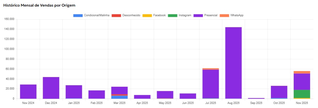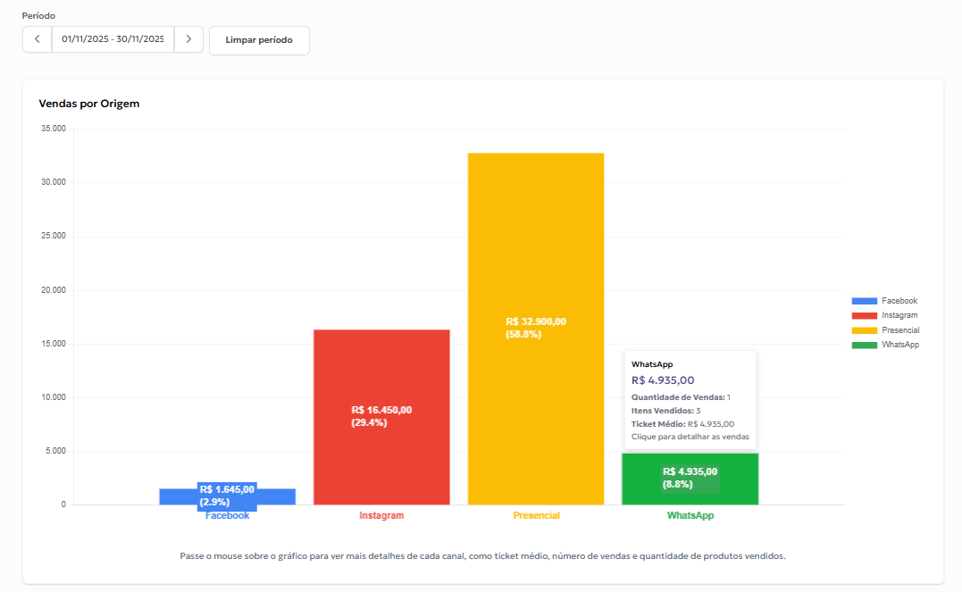 O novo RelatĂłrio de Canais de Venda mostra, em gráficos claros e interativos, o desempenho de cada canal — como loja fĂsica, condicionais, Instagram, Facebook, loja virtual e marketplaces.