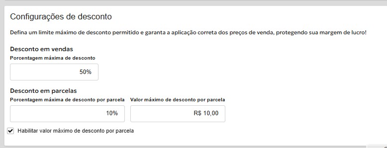Acesse o menu Configurações → Vendas → ative “Valor máximo de desconto por parcela” → informe os valores → Salvar.